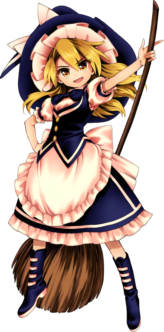Gensokyo. A realm across the boundary of common sense and lack of it, full of Youkai, Gods and other such beings, who all have powers beyond imagination, such as the ability to float away from reality, invoke death in others with just a thought, or manipulate boundaries. Marisa Kirisame is NOT one of these beings. Born to a merchant family who run a shop in the Human Village, Marisa, for reasons unknown, broke off relations with her family and ran away into the Forest of Magic. There, under unknown tutelage (Likely an Evil Spirit named Mima if PC-98 is to be believed), she learned how to use Magic. The conditions for her first meeting with Reimu Hakurei, the Hakurei Shrine Maiden, is unclear, but the two have become best friends over time.